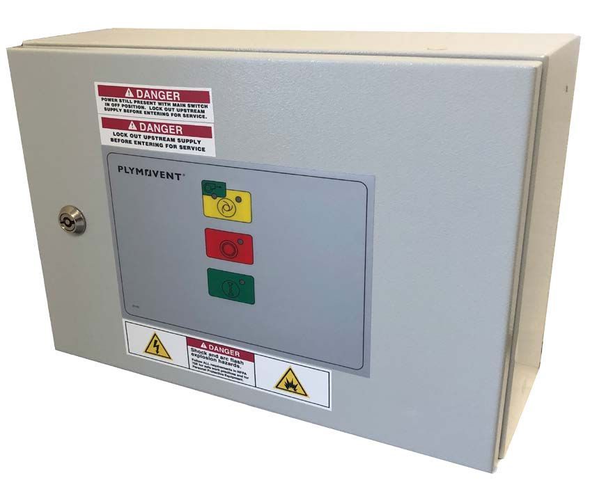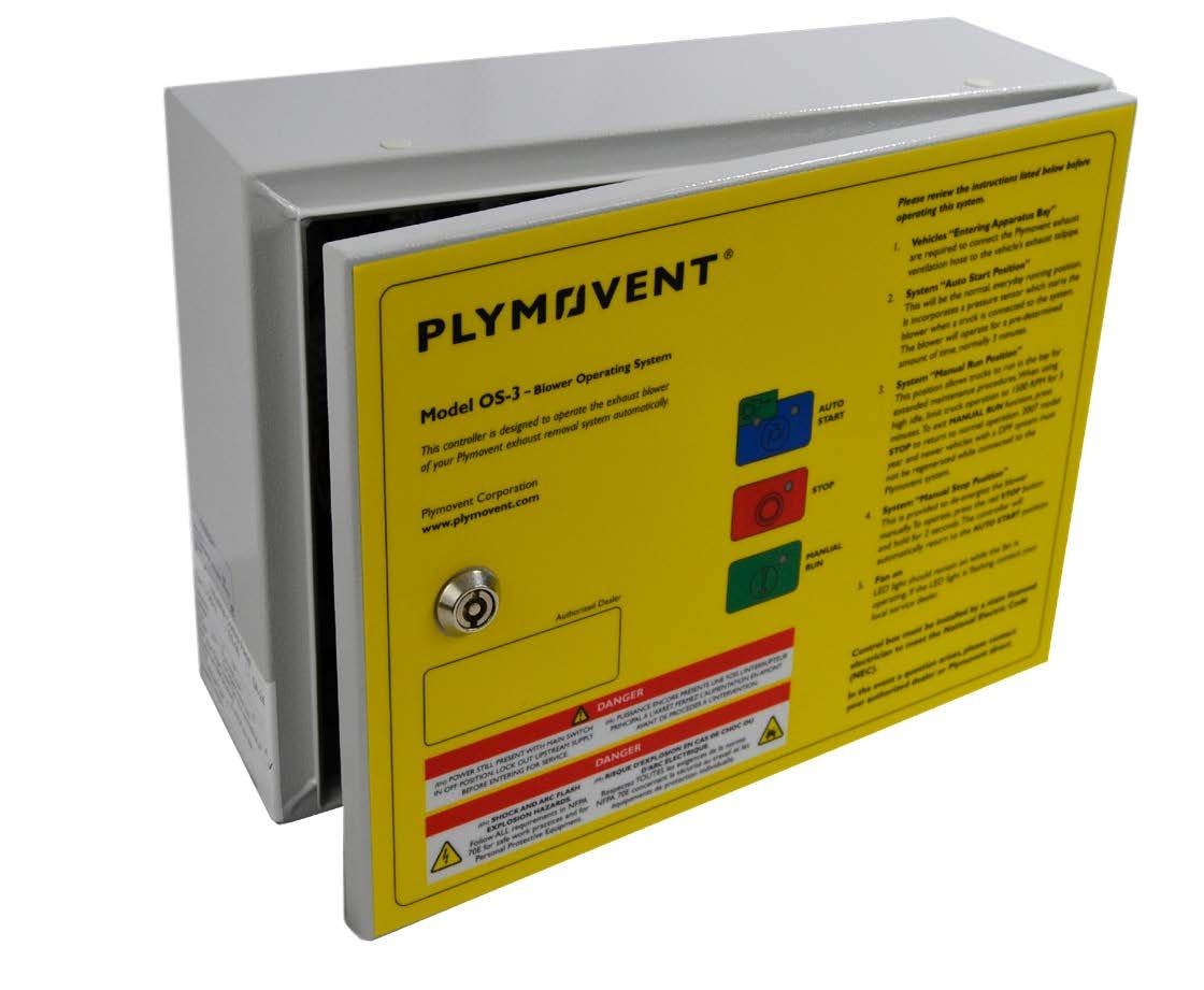 The OS-3 control box is an energy saving control unit designed to be used for controlling exhaust fans in vehicle exhaust systems, with or without a particle filtration system. Together with a pressure switch and optional temperature switch, this energy saving controller makes a fully automatic system for the control of the vehicle exhaust fan. The controller can be set for both manual or automatic control of the fan. Depending on the configuration of a system, several options for switches and remote start functions are available. The two most common types of switches that are typically used are a pressure switch to detect pressure differences in the system when a vehicle is connected, and, an optional temperature switch to detect temperature levels in the system also created when a vehicle is connected.