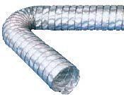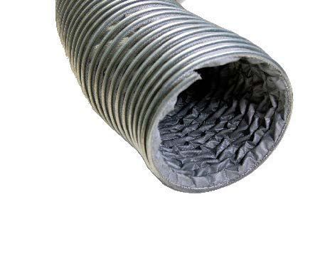 Materials: Silver, two ply, high temperature fabric. Inner hose wall is a heat resistant impregnated glass fabric, outer hose wall is a special coated high temperature, asbestos free fabric, reinforced by woven in stainless steel wire. Galvanized steel helix. Temperature resistance is 1000°F (538°C) continuous and 1200°F (650°C) spike. The plastic helix cover is not available due the high heat capacity.