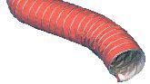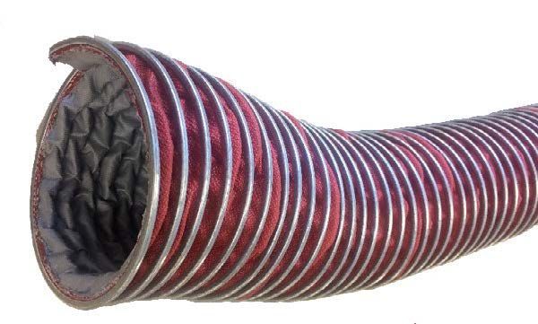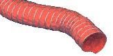 Materials: Made of red fabric, two-layer construction. The inner and outer hose walls are asbestos free high temperature fabric, specially coated with heat stabilizers, reinforced by woven in stainless steel wire that withstands high heat when extracting exhaust from spark ignition engines or diesel engines. Temperature resistance is 1200°F (650°C) continuous and 1380°F (750°C) spike. The plastic helix cover is not available due the high heat capacity.