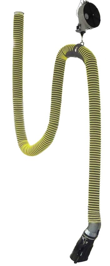 The spring operated hose reel (SER) uses an enclosed spring cassette to recoil the exhaust hose. An operator can pull down the hose to the desired position and pull down again to retract the hose.
